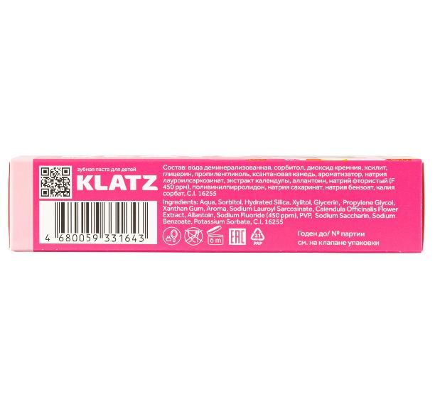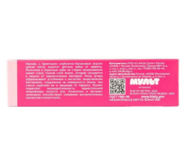 Нежная зубная паста, с приятными клубнично-банановым вкусом, защитит детские зубки от кариеса. Молочные и коренные зубы на стадии прорезывания имеют очень тонкий слой эмали, которая нуждается в защите от кариесогенных бактерий