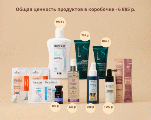 1. Физиогель Шампунь-кондиционер для сухой и чувствительной кожи головы 0+, 250 мл - полноразмерный продукт Мягкий шампунь-кондиционер укрепляет волосы, насыщая их влагой и питательными компонентами. Предотвращает пересушивание кожи головы. Подходит для ежедневного ухода за нежной и чувствительной кожей младенцев. Придает блеск и объем, без отдушек и красителей. 2. Аравия Лабораторис Сыворотка с кератином для выпрямления волос 10 в 1 Keraplastic Serum, 110 мл - полноразмерный продукт Многофункциональная сыворотка предназначена для комплексного ухода за волосами. Средство обладает моментальным и накопительным эффектом. Не утяжеляет волосы после нанесения, обладает эффектом салонной процедуры. Сочетает в себе 10 действий для красоты и силы волос. 3. Оллин Несмываемый крем-спрей для волос 15в1, 100 мл - полноразмерный продукт Инновационная формула «15 в 1» содержит натуральные ингредиенты высокого качества, которые глубоко восстанавливают и увлажняют волосы. После применения волосы мгновенно получают необходимый уход, питание и глянцевый блеск по всей длине. Компактный объем делает продукт идеальным для путешественников. 4. Алфапарф Милано Бессульфатный шампунь для поврежденных волос Reparative Low Shampoo, 75 мл - тревел-формат Мягко очищает волосы. При регулярном применении шампунь постепенно восстанавливает силу и эластичность волос. Не содержит сульфатов. Не утяжеляет волосы. Подходит для частого применения. Цитрусовый, цветочный, древесный, мускусный аромат. 5. Алфапарф Милано Маска для поврежденных волос Reparative Мask,50 мл - тревел-формат Интенсивный уход для глубокого восстановления структуры волоса. При регулярном использовании постепенно повышает устойчивость волос к ломкости. Цитрусовый, цветочный, древесный, мускусный аромат. 6. Кьютэм Восстанавливающий холодный спрей-филлер для волос Instant Strong Effect, 50 мл - полноразмерный продукт Разглаживающи спрей моментального действия с дополнительным глянцевым эффектом. Обеспечивает питание, мгновенное кондиционирование и отличную защиту от влажности. Особенно рекомендован для сухих, пористых, ослабленных, потерявших жизненную силу и здоровый внешний вид. 7. Апивита Шампунь для чувствительной кожи головы с пребиотиками и медом, 20 мл - миниатюра Обеспечивает очень бережное очищение без сульфатов, заботится о естественной микрофлоре кожи головы. Защищает чувствительную кожу головы благодаря пребиотикам и особому комплексу. Успокаивает и уменьшает зуд. Увлажняет и дарит ощущение комфорта. 8. Брелил Профессионал Восстанавливающий шампунь для поврежденных волос Repair Treatment, 15 мл Богатая формула шампуня мягко очищает кожу головы и волосы. Помогает восстановить структуру волосяного покрова в местах наибольшего повреждения. Волосы восстанавливаются, становятся пышными, блестящими и мягкими. Брелил Профессионал Восстанавливающая маска для поврежденных волос Repair Treatment, 15 мл Глубоко питает и способствует реструктуризации волосяного покрова в местах наибольшего повреждения. Волосы восстанавливаются, становятся пышными, блестящими и мягкими. 9. Диксон Шампунь Botol Up, 12 мл Формула основана на коллагене, растительном кератине и гиалуроновой кислоте. Шампунь идеально подходит для очищения ослабленных и лишенных объема волос. Наполняет капиллярное волокно волос, питает и увлажняет, придавая им плотность и объе
