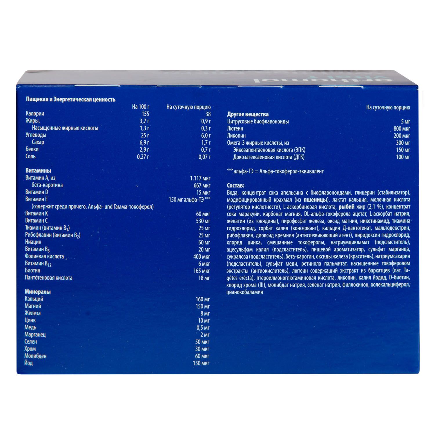 Вода, концентрат апельсинового сока, стабилизатор глицерин, модифицированный крахмал (частично из пшеницы), лактат кальция, подкислитель L-молочная кислота, концентрат сока маракуйи, L- аскорбиновая кислота, рыбий жир, карбонат магния, мальтодекстрин, натрия L-аскорбат, Витамин E, стабилизатор гумми арабикум,желатин, растительное масло, никотинамид, консерватор сорбат калия, витамин В1 - гидрохлорид, Витамин В2, Витамин В6 - гидрохлорид, хлорид цинка, кальция D - пантотенат, подсластитель ацесульфам К, подсластитель цикламат натрия, экстракт томатов, глюконат железа, сульфат марганца, ароматизатор, подсластитель сахарин натрия, бета-каротин, экстракт паприки, сульфат меди, краситель сахарный колер III, фолиевая кислота, Витамин А - пальмитат, лютеин, подсластитель суклароза, йодид калия, D - биотин, хлорид хрома (III), молибдат натрия, селенат натрия, Витамин K1, Витамин В12, Витамин D3.