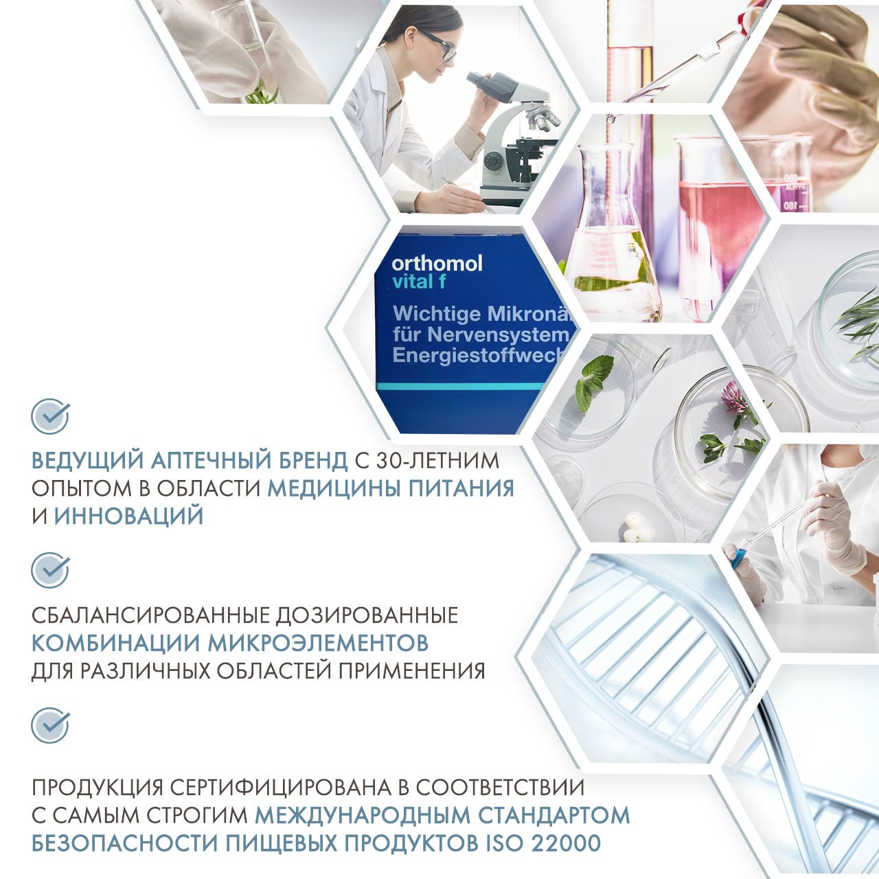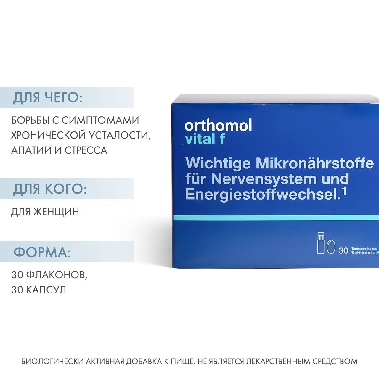 Orthomol Vital F - витаминно-минеральный комплекс, разработанный специально для женщин. Предназначен для борьбы с симптомами хронической усталости, апатии и стресса. Уменьшает проявления нервозности, тревожности, обеспокоенности, усталости. Содержащиеся микроэлементы и витамины улучшают работу нервной системы, стимулируют обменные процессы, белковый и углеводный обмен, улучшает доставку кислорода к тканям, поддерживает здоровье костей, зубов и волос, нормализует сон и лечат бессонницу, повышают работоспособность.
