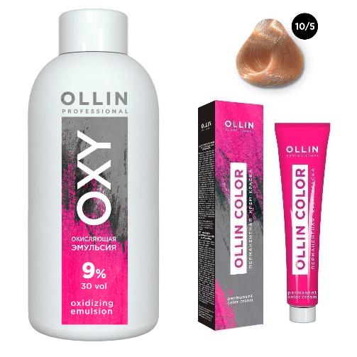Набор "Перманентная крем-краска для волос Ollin Color оттенок 10/5 светлый блондин махагоновый, 100 мл + Окисляющая эмульсия Oxy 9%, 150 мл"