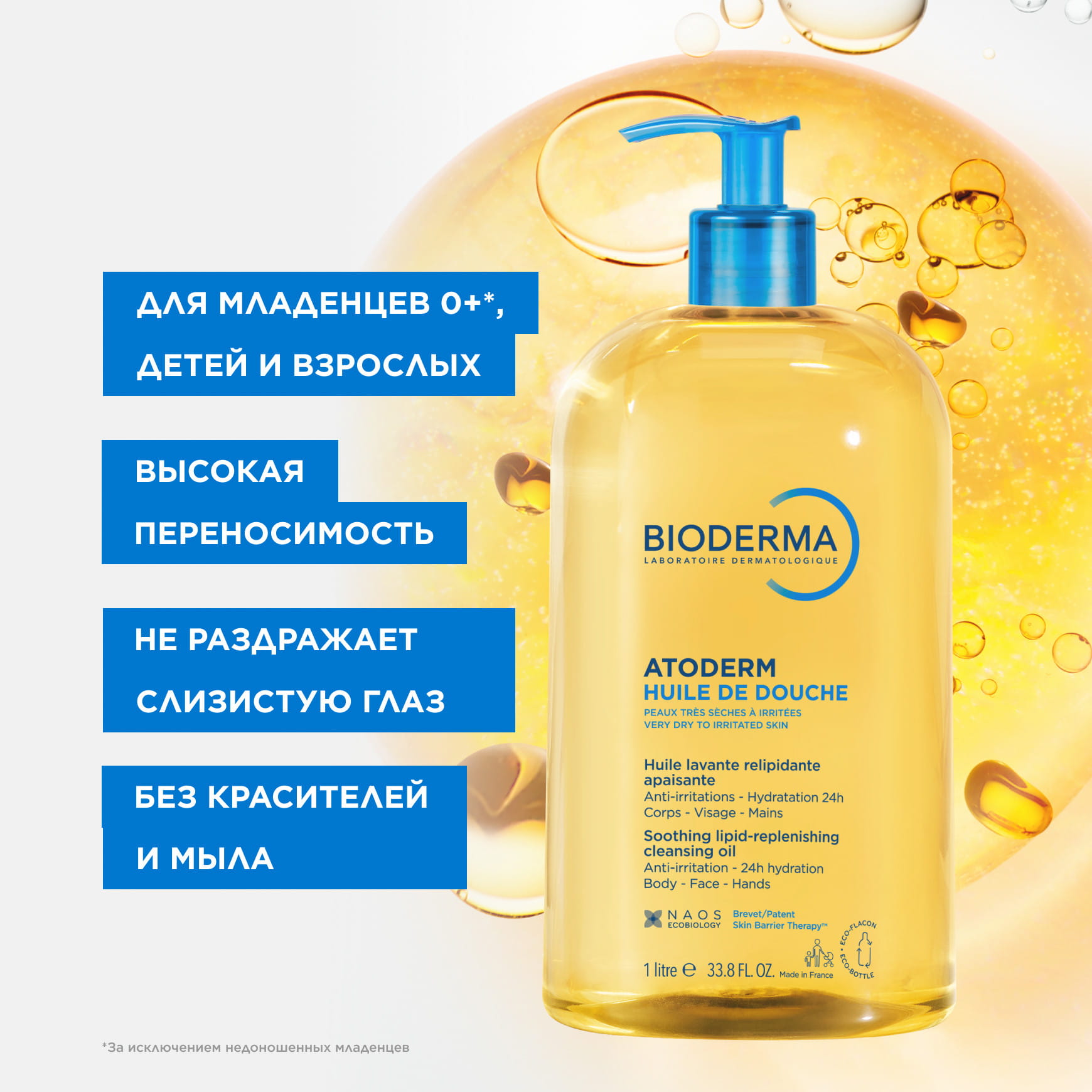 Большой объем и удобный дозатор-помпа делают продукт выгодным к покупке. Подходит для всей семьи (взрослые, подростки, дети, новорожденные) за исключением недоношенных младенцев.