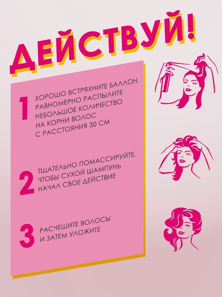 Хорошо встряхните баллон. Равномерно распылите небольшое количество на корни волос с расстояния 30 см. Подождите 3 минуты, тщательно помассируйте, чтобы шампунь начал действовать. Расчешите волосы и затем уложите.