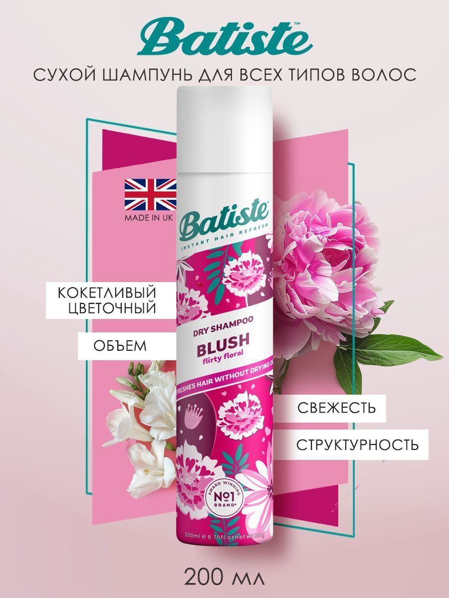 Batiste Blush- сухой шампунь для волос с цветочным ароматом, для быстрого придания свежести, объема и структурности. Его действие аналогично обычному шампуню, а приятный аромат привлекает внимание. Основные ноты - пион, фрезия и апельсиновая кожура. Спрей подойдет для всех типов волос – натуральных, окрашенных, коротких или длинных, седых, осветленных, сухих, жирных, тонких или вьющихся, поврежденных и ослабленных.