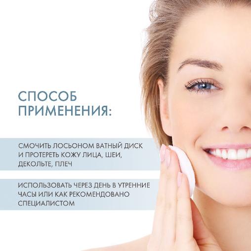 Протирайте очищенное лицо, веки и шею ватным диском пропитанным лосьоном один раз в день в утренние часы.