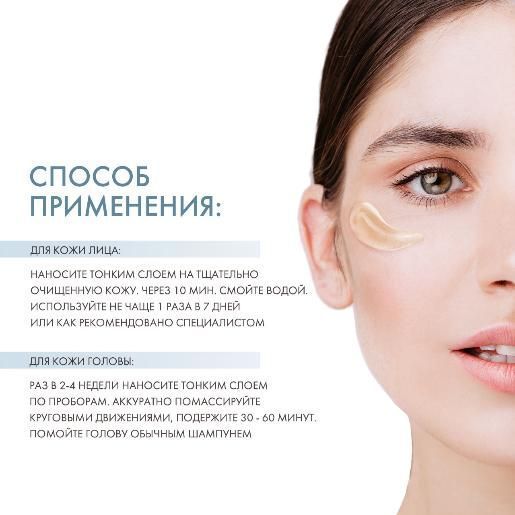 Средство универсально и его можно использовать на любых участках кожи, в том числе и кожи головы. Пилинг способствует очищению волосяных фолликулов и обновлению эпидермиса, улучшает микроциркуляцию и обмен веществ. Успешно применяется при диффузном выпадении волос.
