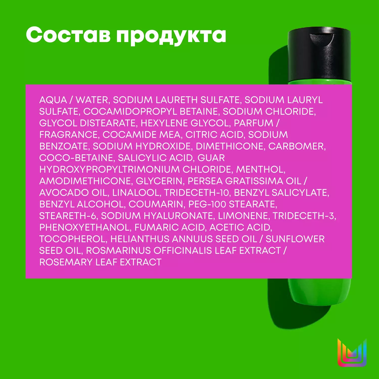 Состав: aqua / water / eau, sodium laureth sulfate, sodium lauryl sulfate, cocamidopropyl betaine, sodium chloride, glycol distearate, hexylene glycol, parfum / fragrance, cocamide mea, citric acid, sodium benzoate, sodium hydroxide, dimethicone, carbomer, coco-betaine, salicylic acid, guar hydroxypropyltrimonium chloride, menthol, amodimethicone, glycerin, persea gratissima oil / avocado oil, linalool, trideceth-10, benzyl salicylate, benzyl alcohol, coumarin, peg-100 stearate, steareth-6, sodium hyaluronate, limonene, trideceth-3, phenoxyethanol, fumaric acid, acetic acid, tocopherol, helianthus annuus seed oil / sunflower seed oil, rosmarinus officinalis leaf extract / rosemary leaf extract