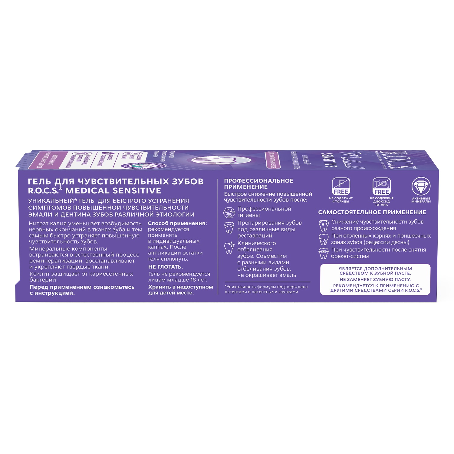 Предназначен для применения в профессиональной практике врача-стоматолога и по назначению врача в домашних условиях. Необходимо строго выполнять рекомендации врача по применению! Гель обладает реминерализующим эффектом. Быстро снижает чувствительность после манипуляций (профессиональная чистка, отбеливание, препарирование для прямых и непрямых реставраций без депульпирования), при некариозных поражениях зубов (эрозии, клиновидные дефекты, патологическая стираемость и пр.), заболеваниях пародонта, в процессе ортодонтического лечения и по завершению.