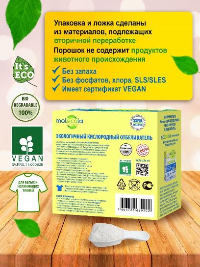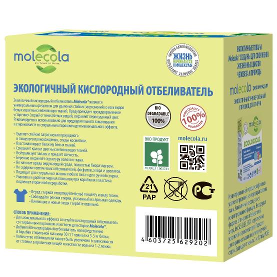 Экологичный кислородный отбеливатель Molecola® является универсальным средством для удаления стойких загрязнений со всех видов цветных и белых тканей. Предупреждает преждевременное «старение» (серый оттенок) белых вещей, сохраняет первозданный цвет. Рекомендуется использовать для предварительного замачивания и стирки вместе со стиральным порошком для максимального эффекта.
