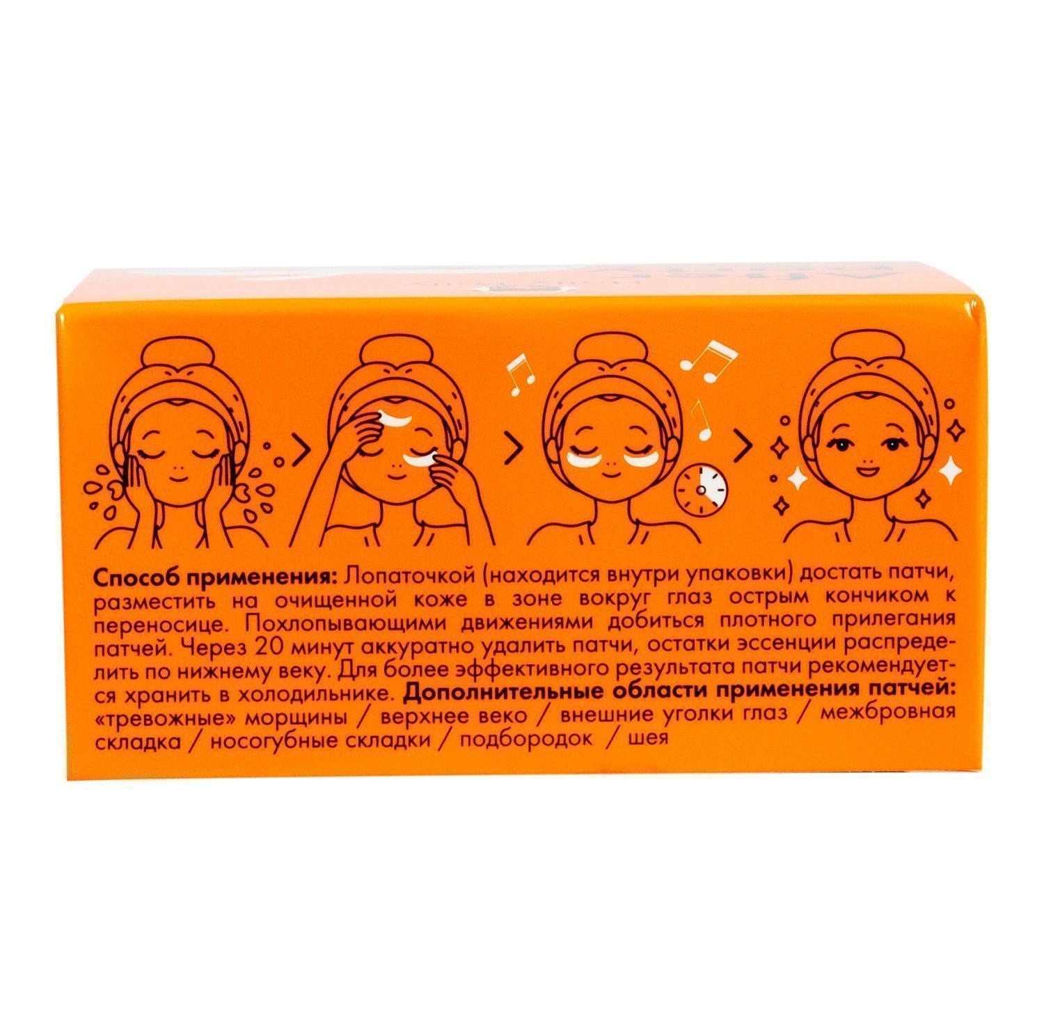 Специальной лопаточкой достаньте патчи и разместите на очищенной коже вокруг глаз острым кончиком к переносице. Похлопывающими движениями добейтесь плотного прилегания. Через 20 мин аккуратно удалите патчи, остатки эссенции распределите по верхнему веку. Для более эффективного результата рекомендуется хранить патчи в холодильнике. В случае появления раздражения - прекратить использование.