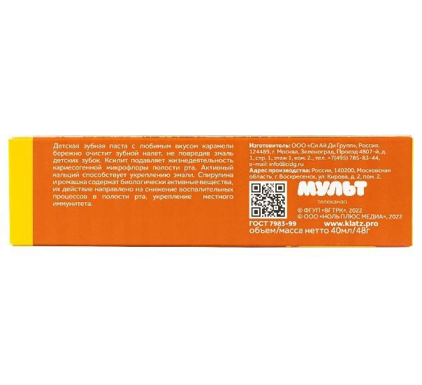Детская зубная паста с любимым вкусом карамели бережно очистит зубной налет, не повредив эмаль детских зубок.