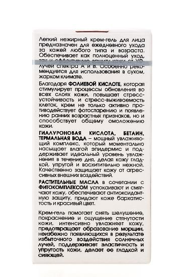 Легкий нежирный крем-гель для лица обеспечивает интенсивное увлажнение в течение всего дня и надежную защиту от широкого спектра лучей UVA/UVB. Подходит для любого типа кожи и возраста.