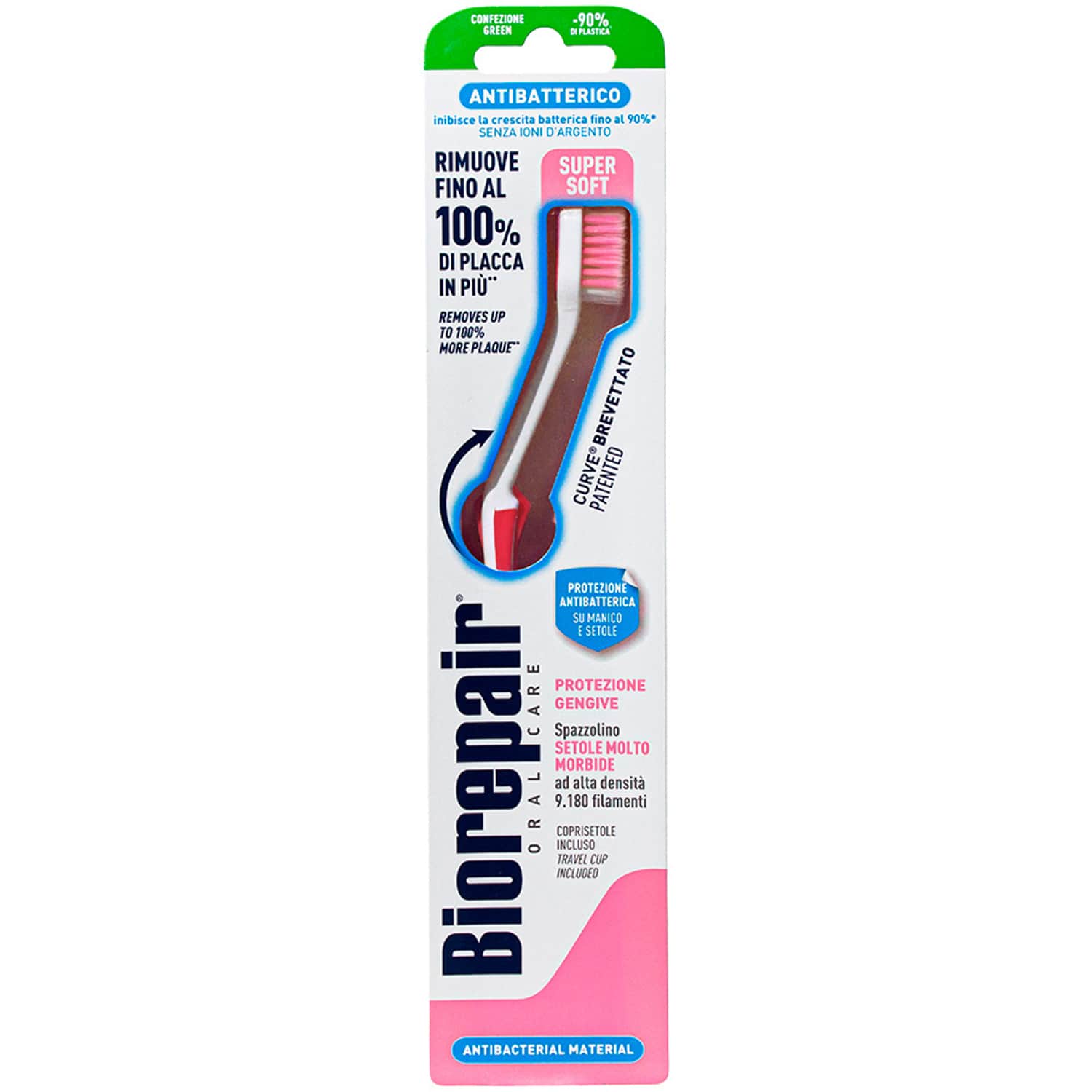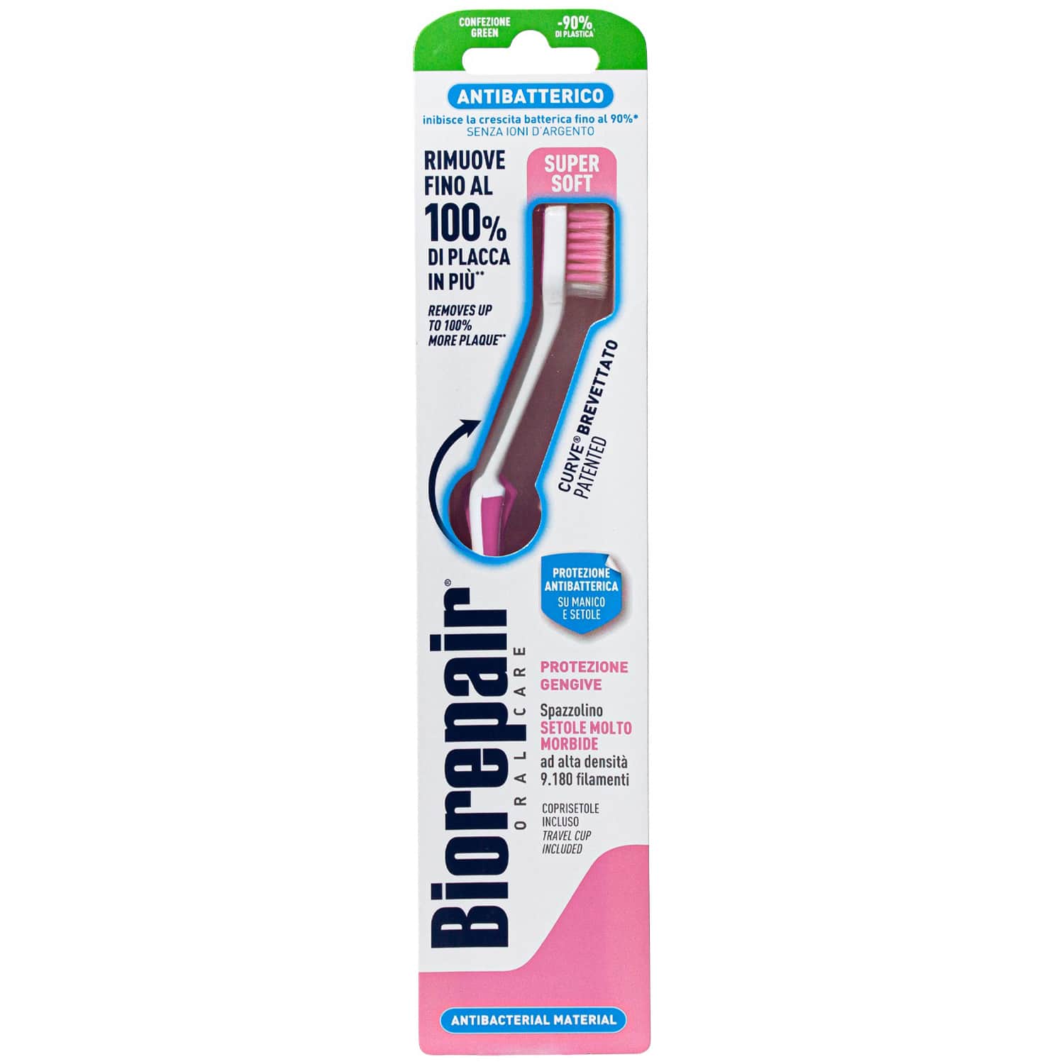 Зубные щетки Biorepair® имеют 3-и уникальности: SCP — Self Cleaning Polymer Самоочищающийся полимер, Форма щетки и Щетинки обработаны частицами microRepair®. Зубная щётка Biorepair® CURVE Protenzione Gengive Защита дёсен. Ультрамягкие щетинки | 9 180 щетинок | 4 цвета. Ультрамягкие конические щетинки с ультратонкими кончиками для деликатного ухода за воспаленными деснами.